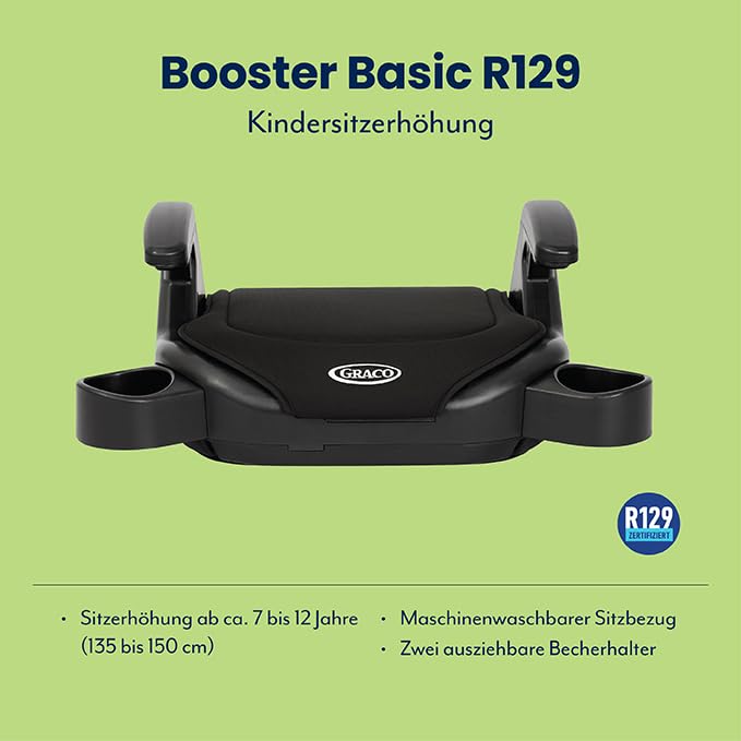 Einzelheiten: Die Graco Booster Basic R129 Kindersitzerhöhung vereint Sicherheit, Komfort und Funktionalität in einem. Sie ist zugelassen nach der aktuellsten EU-Sicherheitsnorm R129, um eure Kinder bestmöglich zu beschützen. Das Leichtgewicht mit nur 1,4 kg lässt sich kinderleicht von einem Auto in ein anderes umbauen und mit den zwei ausziehbaren Becherhaltern haben eure Kids Getränke, Snacks oder Spielzeuge auf jeder Fahrt griffbereit. Wenn ihr sie nicht braucht, könnt ihr sie ganz einfach im Sitz verstecken. Und auch der Komfort kommt beim Booster Basic R129 dank seiner extra gepolsterten Sitzbezüge nicht zu kurz. Eure Großen sitzen darauf schön gemütlich – auch auf langen Fahrten. Komfortabel auch für euch als Eltern: der Sitbezug lässt sich super easy entfernen und in der Waschmaschine waschen. Die Sitzerhöhung ist zugelassen ab 135 bis 150 cm und begleitet euch damit bis zum Ende der Kindersitzpflicht. Produktabmessungen: 36,8 x 42,5 x 21,1 cm (L x B x H) Produktgewicht: 1,4 kg Lieferumfang: 1 Sitzerhöhung Booster Basic R129, 1 Gebrauchsanleitung
